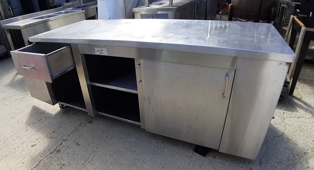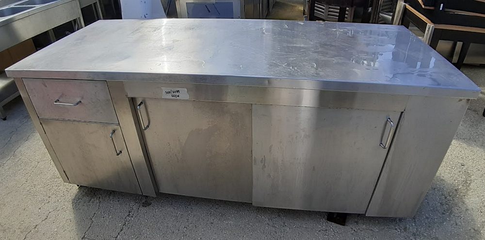 Μεταχειρισμένος, ανοξείδωτος πάγκος ερμάριο, με 1 συρτάρι, 1 ανοιγόμενη πόρτα και 2 συρόμενες πόρτες. Σε καλή κατάσταση. Διαστάσεις: 200x82x86εκ. Τιμή: 800€.