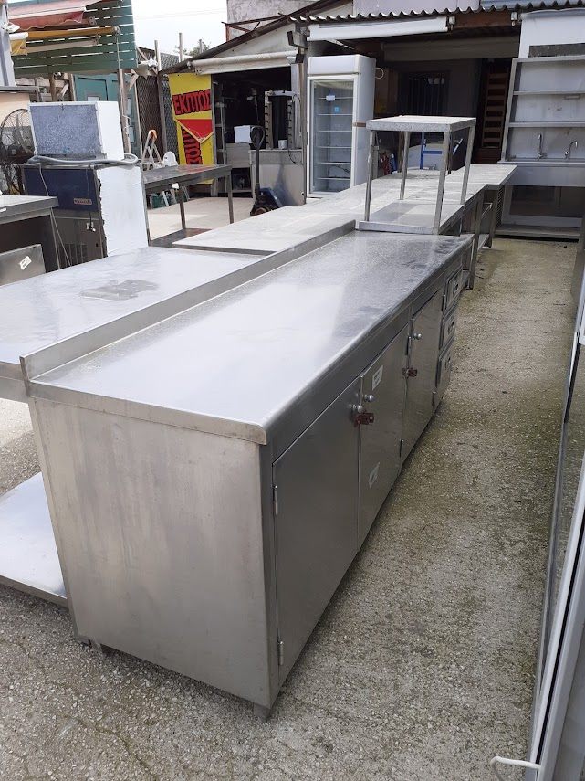 Μεταχειρισμένος, ανοξείδωτος πάγκος ερμάριο, με 3 ανοιγόμενες πόρτες και 3 συρτάρια. Σε καλή κατάσταση. Διαστάσεις: 220x60x85εκ. Τιμή: 900€.