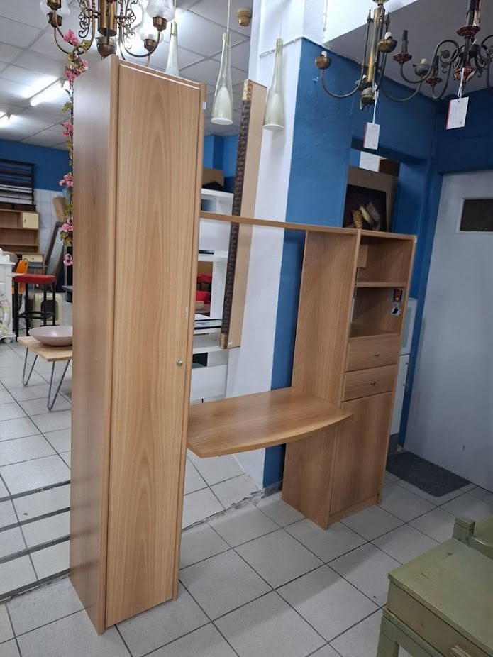 Μεταχειρισμένη σύνθεση γραφείου με βιβλιοθήκη, ξύλινης κατασκευής σε φυσικό χρώμα. Περιλαμβάνει ψηλό ντουλάπι, γραφείο, ράφια, συρτάρια και επιπλέον ντουλάπι αποθήκευσης. Σε καλή κατάσταση. Διαστάσεις: 173x200x36 εκ. Τιμή: 110€/τμχ.