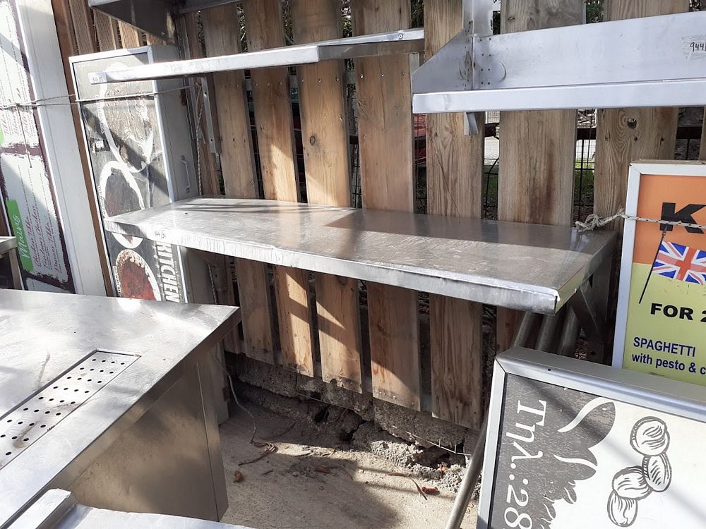 Used stainless steel, wall shelf. Ideal for catering and commercial kitchens. In good condition. Dimensions: 150×45 cm. Price: 100€/pc