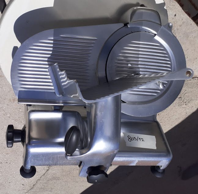 Used, professional meat slicer. In good condition. Dimensions: 46x33x50cm, diameter of knife 28cm. Price: 400€.