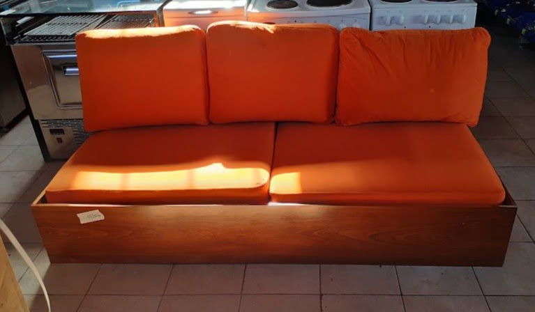 Μεταχειρισμένος τριθέσιος καναπές με ξύλινη βάση και πορτοκαλί μαξιλάρια. Χωρίς πλάτη. Σε καλή κατάσταση. Διαστάσεις: 80×188εκ. Τιμή: 100€