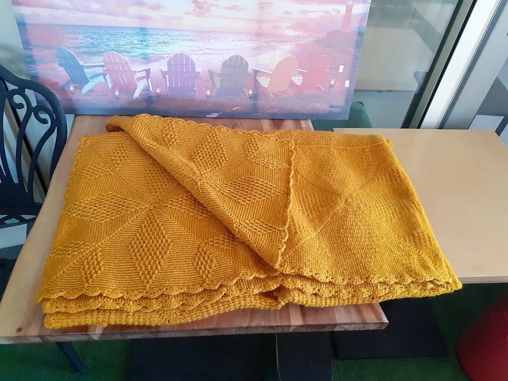 Used, handmade knitted blanket, woolen in mustard color. Dimensions: 230×180 cm. In good condition. Price: 80€