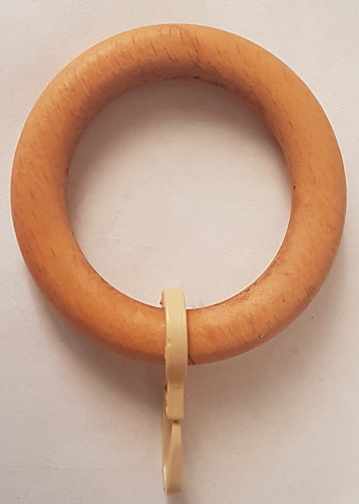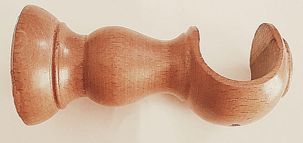 Κουρτινόβεργα ξύλινη με τα διακοσμητικά τελειώματα, τους κρίκους, τα στηρίγματα και τα άγγιστρα.