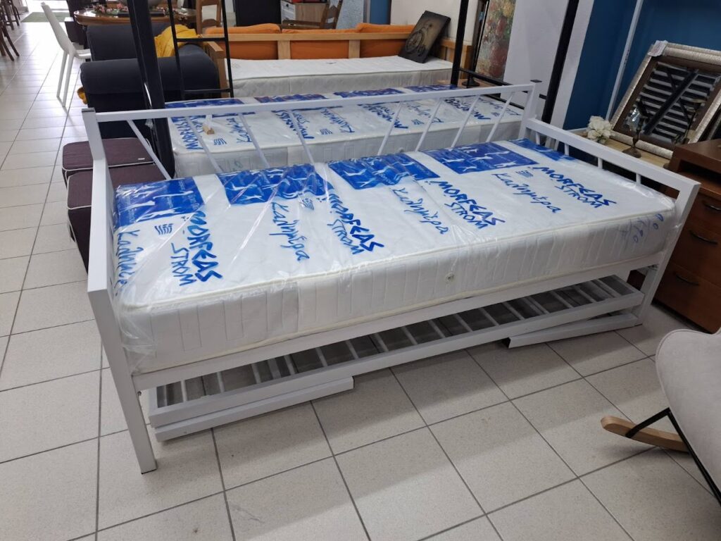 Καινούργιο, μεταλλικό, διπλό κρεβάτι καναπές, λευκό χρώμα. Διαστάσεις κάθε κρεβατιού: 90×190 εκ. Στην τιμή δεν συμπεριλαμβάνονται τα στρώματα. Τιμή 180 €