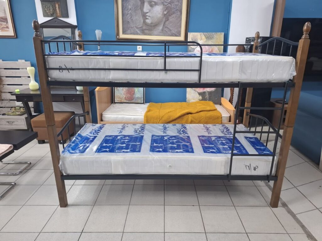 Καινούργιο κρεβάτι-κουκέτα, με προστατευτικά πλαϊνά και σκάλα, με μεταλλικό σκελετό και ξύλινα στοιχεία. Δυνατότητα διαχωρισμού σε δύο μονά κρεβάτια. Διαστάσεις κουκέτας: 200x95x158 εκ., στρώματος:90×190 εκ. Στην τιμή δεν συμπεριλαμβάνονται τα στρώματα. Τιμή: 180€/τμχ.