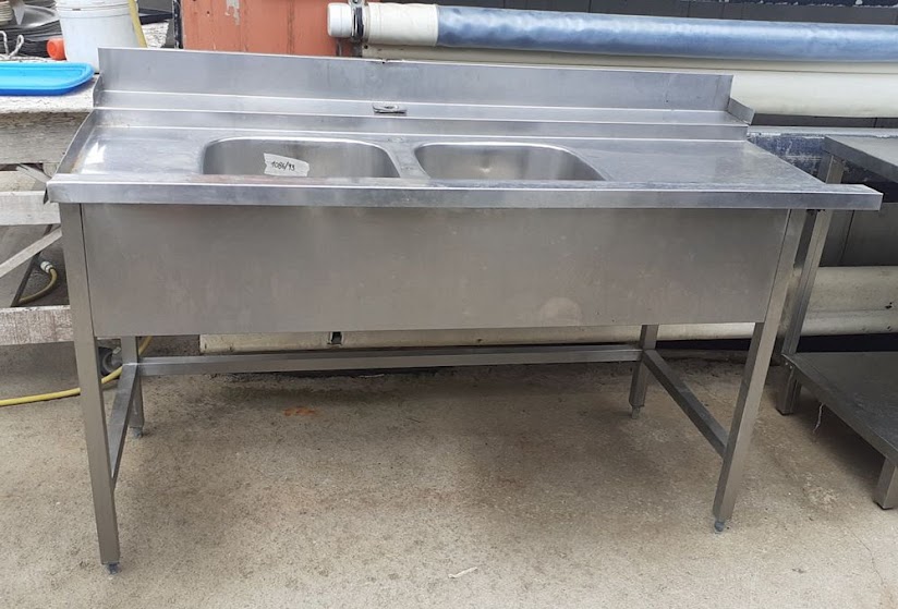 Used stainless steel double sink. Dimensions: 160x73x88cm. Basin dimensions: 40x40x25 cm. In good condition. Price: 450€