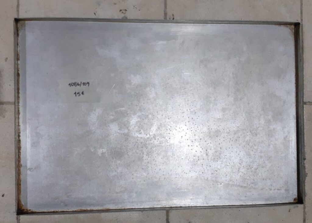 Used professional aluminum baking trays, suitable for ovens. In good condition. Dimensions: 60×40 cm. Price: €15/pc.