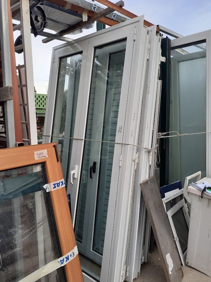Used aluminum balcony door, white color, with double glazing and integrated shutter. In good condition. Dimensions: 118×233 cm. Price: 450€/pcs.