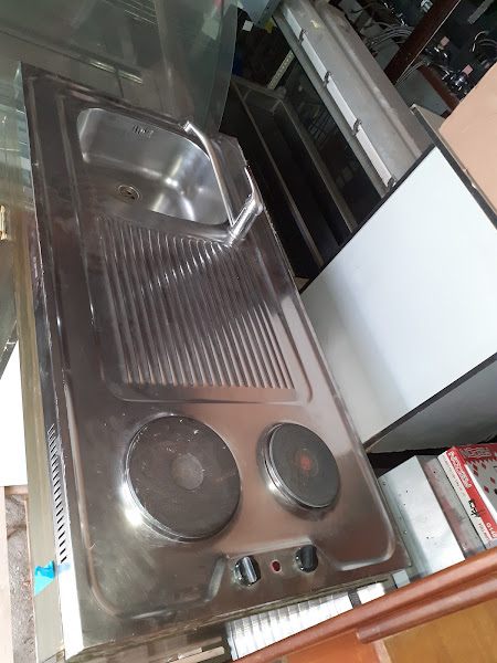 Used stainless steel sink with two electric hobs. In good condition. Dimensions: 120×60 cm. Price: €50.