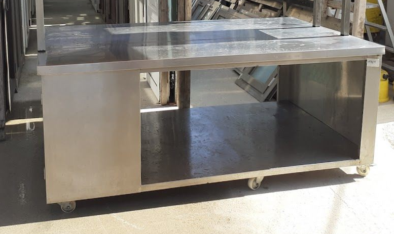 Μεταχειρισμένος, τροχήλατος, ανοξείδωτος πάγκος μέσης. Σε καλή κατάσταση. Διαστάσεις: 200x120x86εκ. Τιμή: 500€.