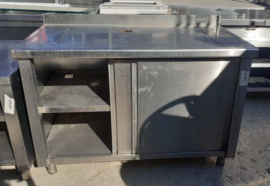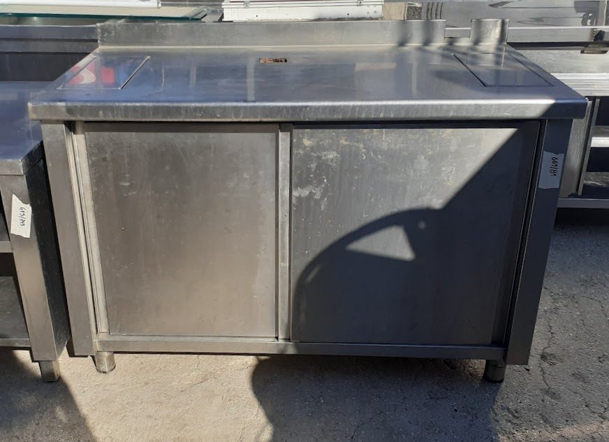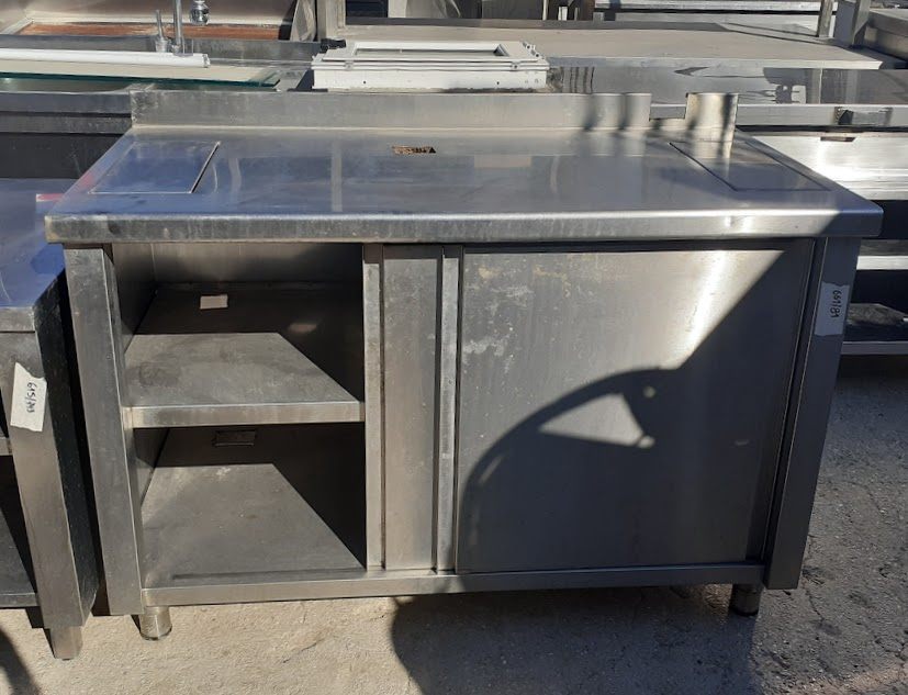 Μεταχειρισμένος, ανοξείδωτος πάγκος ερμάριο, με δύο συρόμενες πόρτες. Σε καλή κατάσταση. Διαστάσεις: 130x70x88εκ. Τιμή: 300€