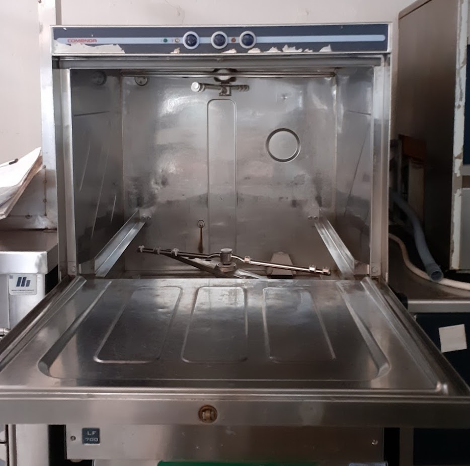 Μεταχειρισμένο επαγγελματικό πλυντήριο πιάτων Comenda, ανοξείδωτης κατασκευής. Κατάλληλο για χώρους εστίασης. Σε καλή κατάσταση. Διαστάσεις: 60x60x82 εκ, ιδανικό για μπασκέτα 50×50εκ. Τιμή: 900€/τμχ.
