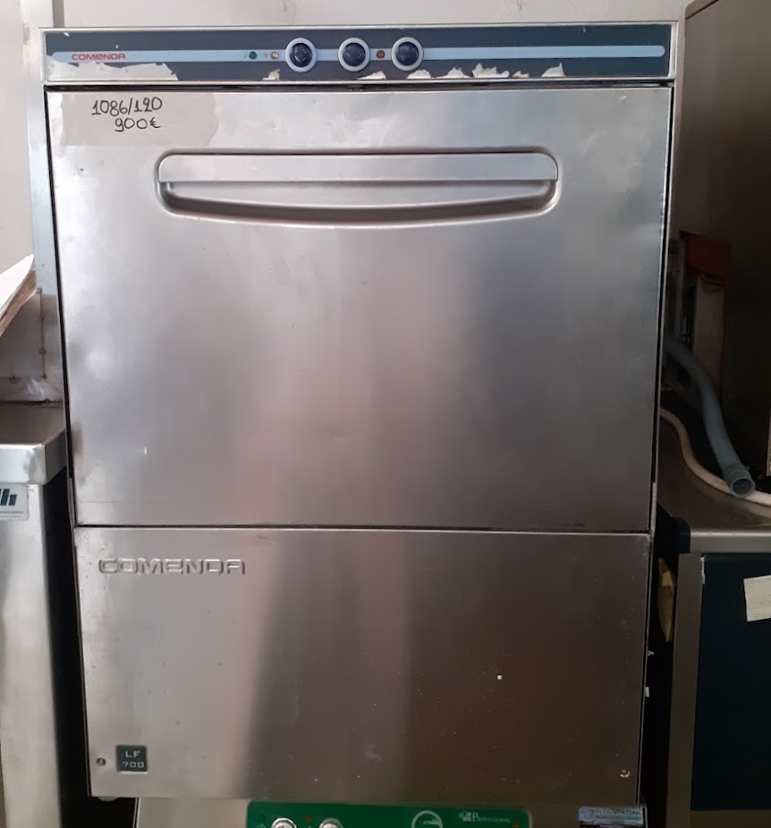 Used professional Comenda dishwasher, stainless steel construction. Suitable for food service establishments. In good condition. Dimensions: 60x60x82 cm. Price: 900€/pc.