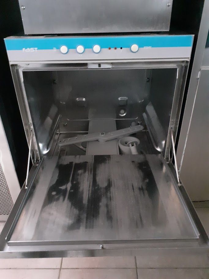 Used professional dishwasher/glasswasher Eletrobar Fast. High-durability stainless steel construction, ideal for cafes, bars, and restaurants. In good condition. Dimensions: 57x60x82cm. Price: 600€/pc