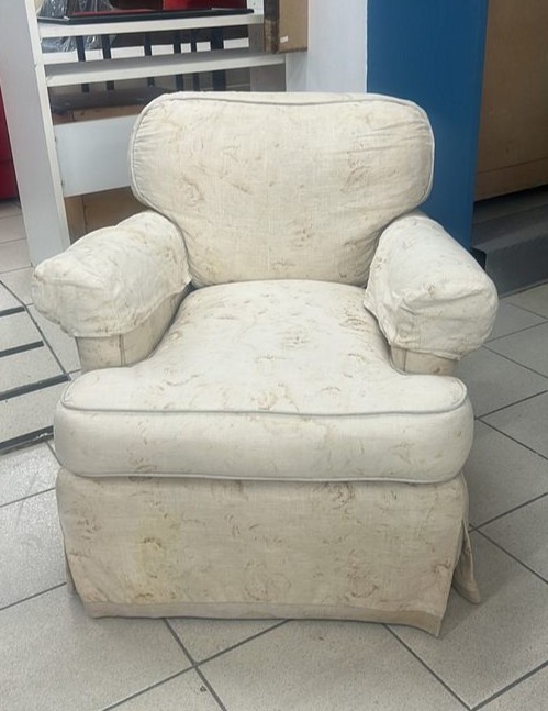 Μεταχειρισμένη λευκή, κουνιστή πολυθρόνα, περιστρεφόμενη, αναπαυτική. Σε πολύ καλή κατάσταση. Διαστάσεις: 75x95x80εκ. Τιμή: 250€.