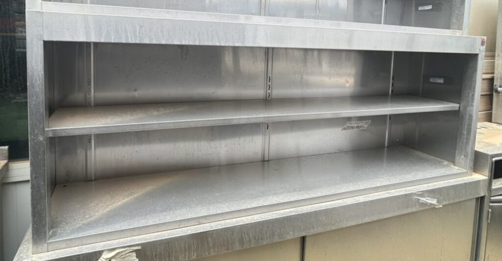Used stainless steel wall cabinet with one shelf. In good condition. Dimensions: 190x40x70cm. Price: 300€.