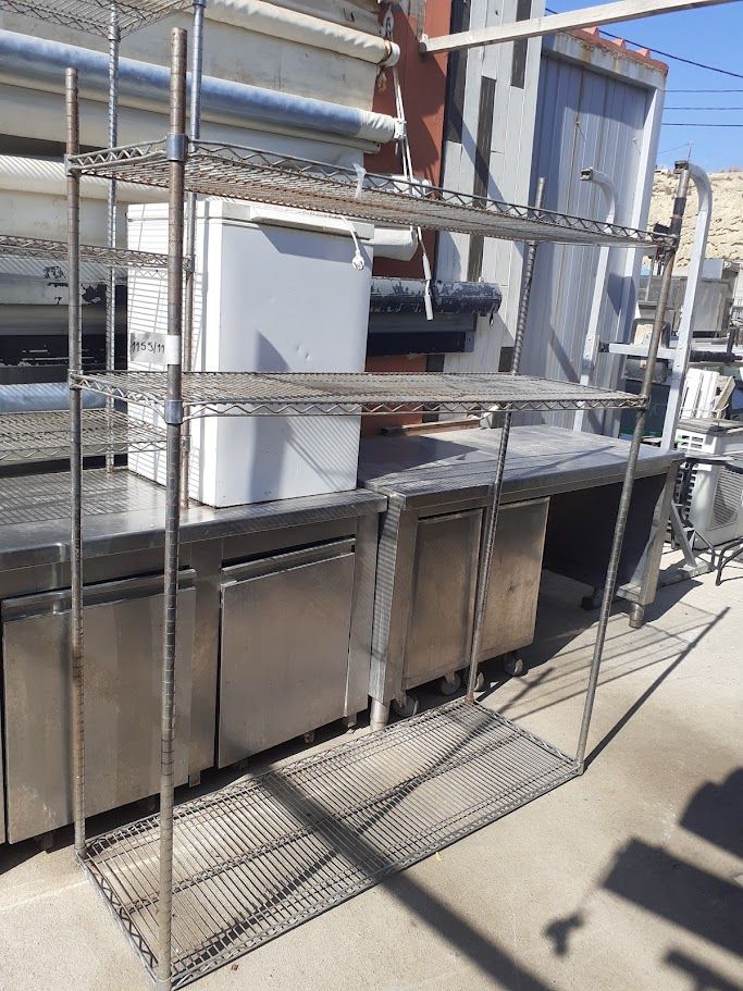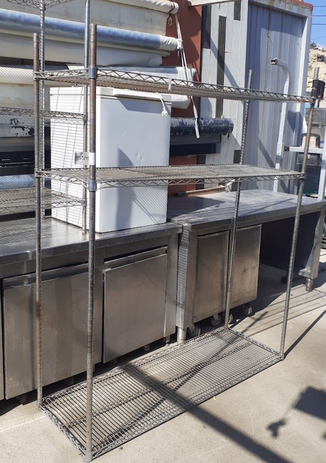 Used stainless steel, freestanding professional shelving unit with three shelves. In good condition. Dimensions: 120x53x139 cm. Price: 200€