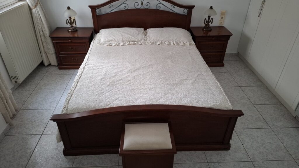 Μεταχειρισμένο σετ κρεβατοκάμαρας, από ξύλο καρυδιάς, με διπλό κρεβάτι , δύο κομοδίνα και ένα σκαμπό. Σε άριστη κατάσταση. Διαστάσεις: 280×167 εκ. Τιμή: 600€.