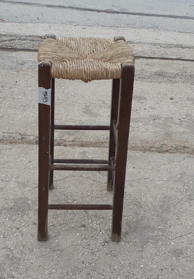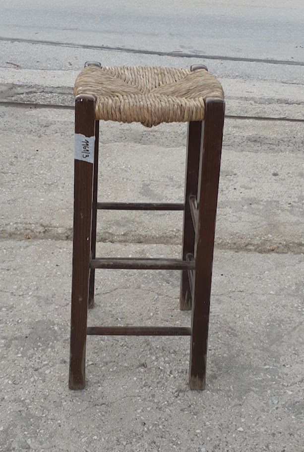 Used bar stool, wooden construction with straw seat. In good condition. Dimensions: 30x30x78 cm. Price: 25€/pc