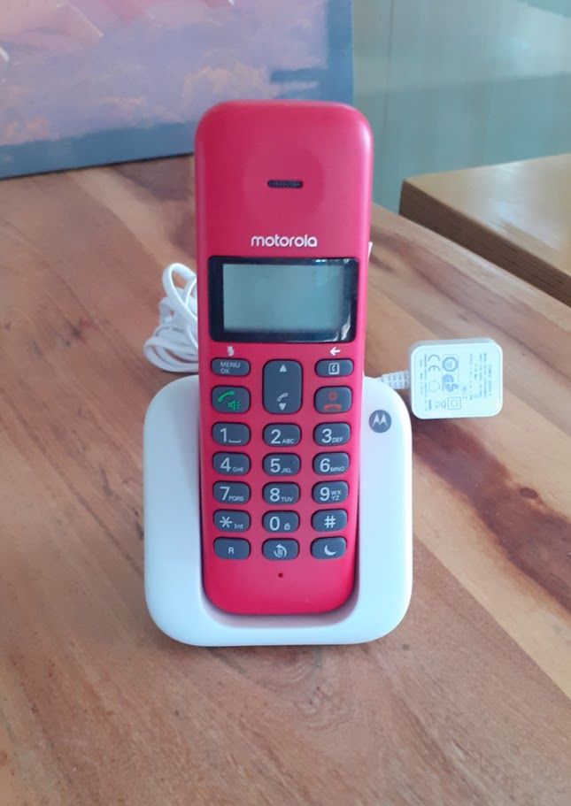 Used Motorola cordless landline phone, in red color. In good condition. Price: 15€