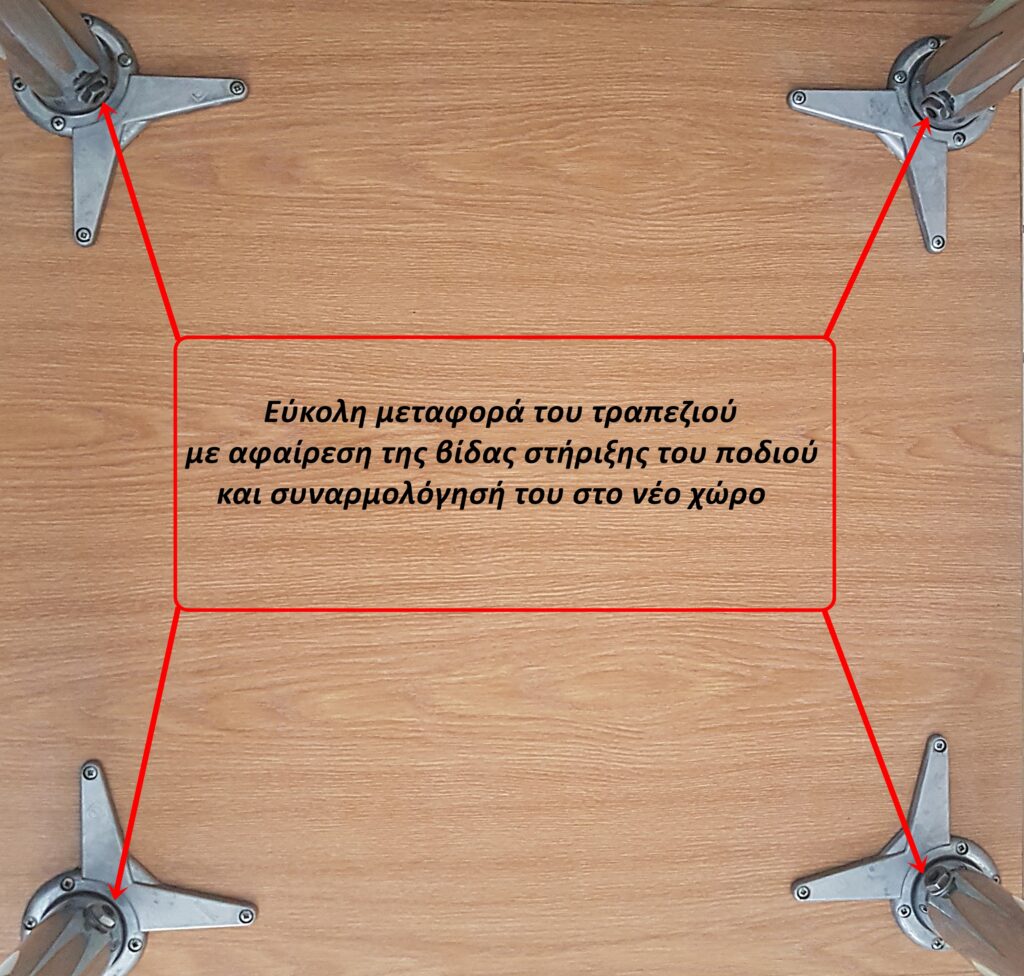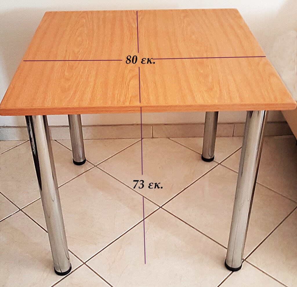 ΠΩΛΟΥΝΤΑΙ Τραπέζι και 2 καθίσματα. Διαστάσεις Τραπεζιού: Μήκος 80 εκατοστά, Πλάτος 80 εκατοστά, Ύψος 73 εκατοστά. Δυνατότητα ρύθμισης του ύψους των ποδιών του τραπεζιού. Ευκολία μεταφοράς του τραπεζιού. Τα πόδια αποσπώνται εύκολα με ξεβίδωμα μιας βίδας του ποδιού και βίδωμα στο νέο χώρο. Τα είδη πωλούνται και έκαστο χωριστά.