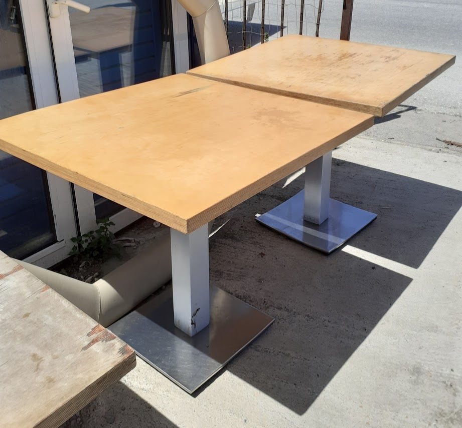 Used, outdoor and indoor wooden table, with metal base. In good condition. Dimensions: 80x80x76cm. Price: 50€/pcs.