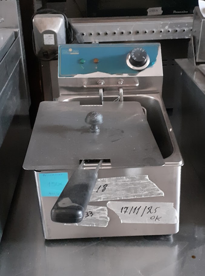Used professional, inox, electric fryer. Features a removable basket and adjustable thermostat. Ideal for catering and food service businesses. In good condition. Dimensions: 31x55x42cm. Price: 150€/pc