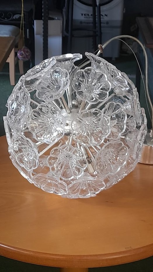 Μεταχειρισμένο, γυάλινο φωτιστικό οροφής, σε σχήμα μπάλας με λουλούδια. Σε καλή κατάσταση. Τιμή: 150€
