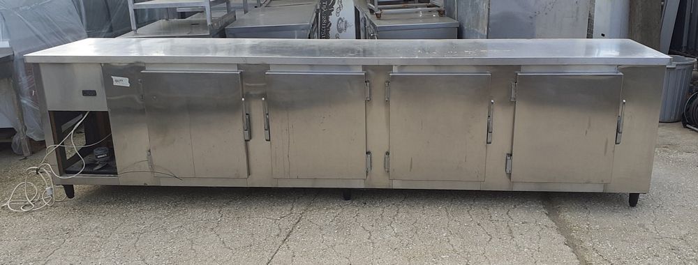 Used professional, inox counter refrigerator, four-door, with internal motor. In good condition. Dimensions: 350x70x91 cm. Price: 800€/pc.